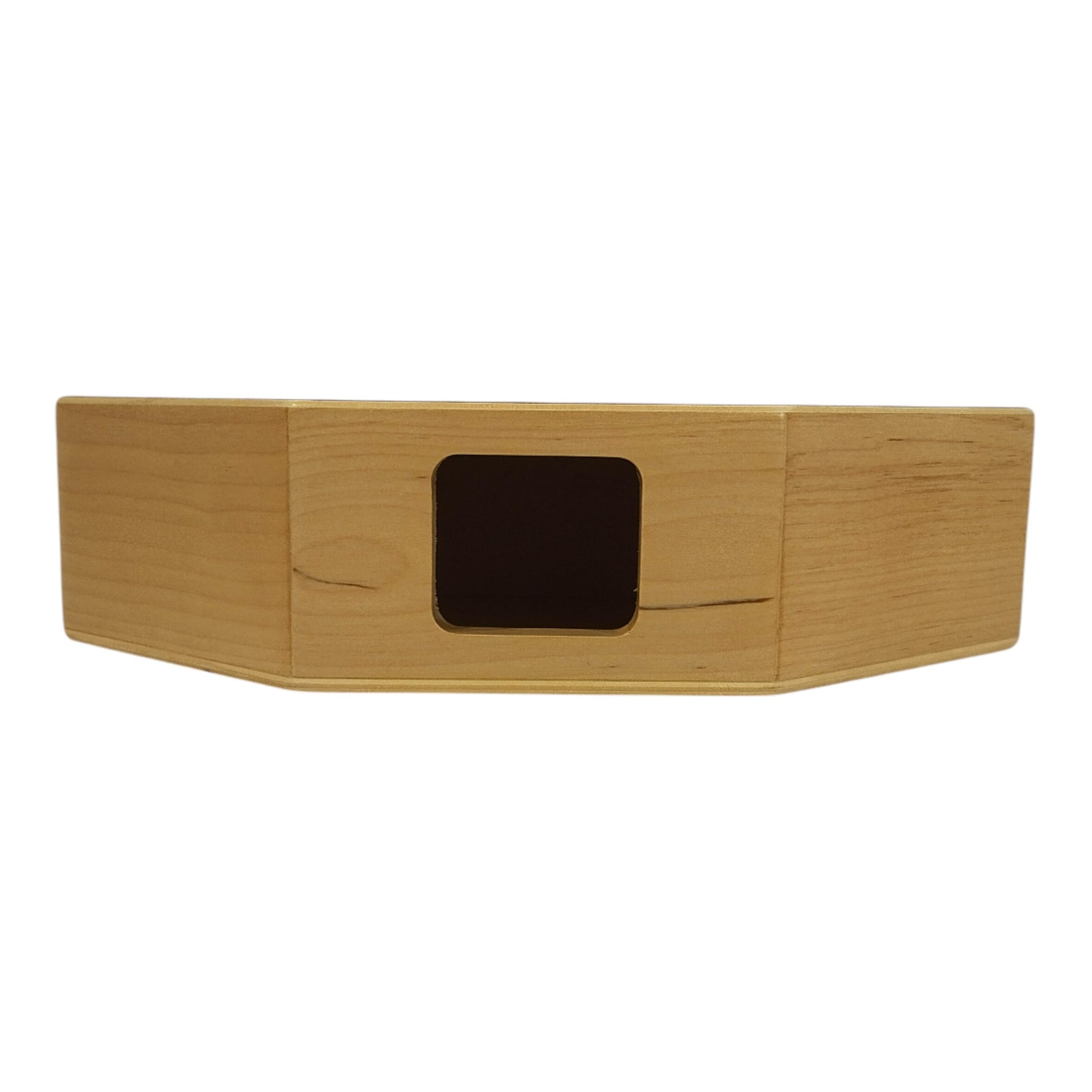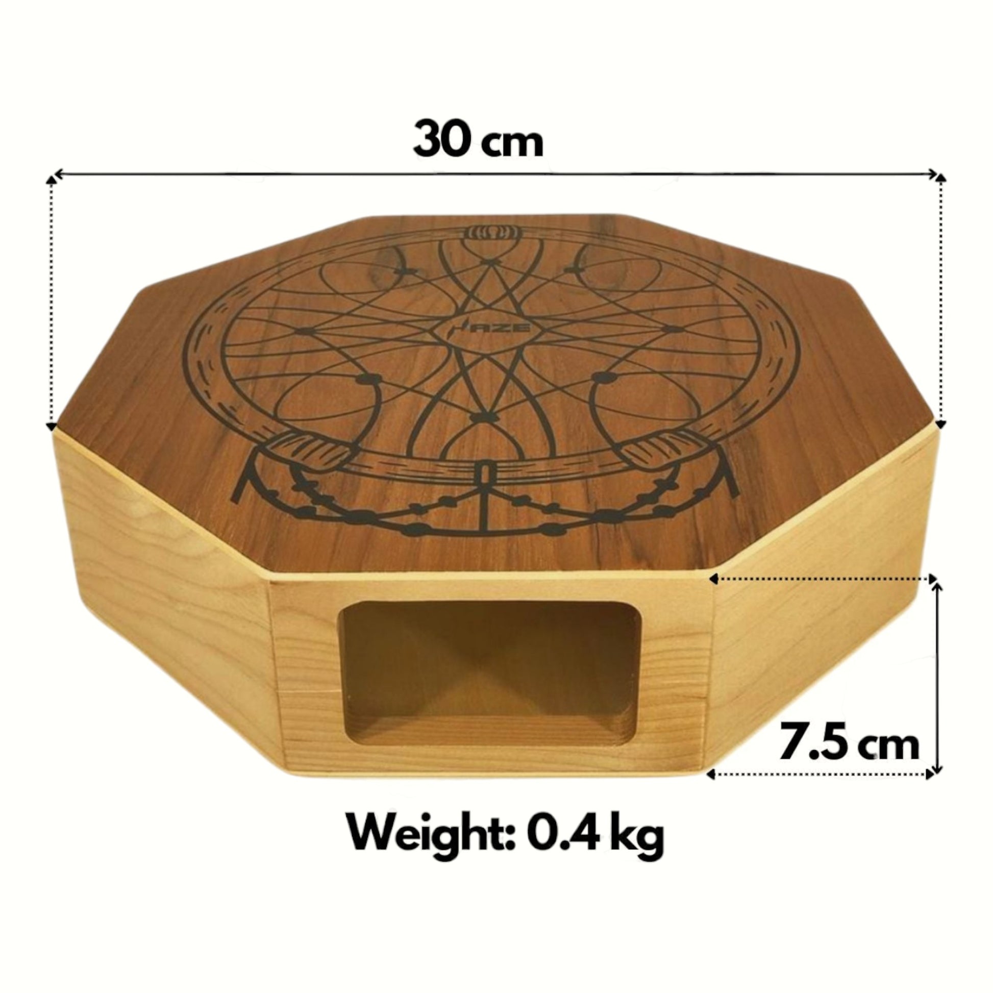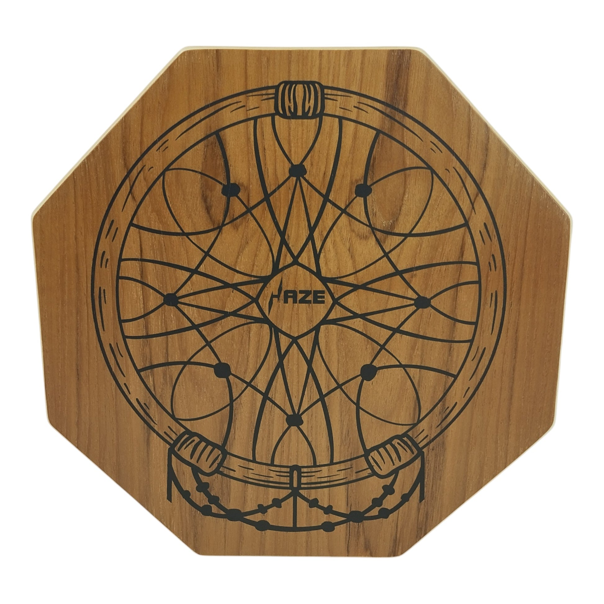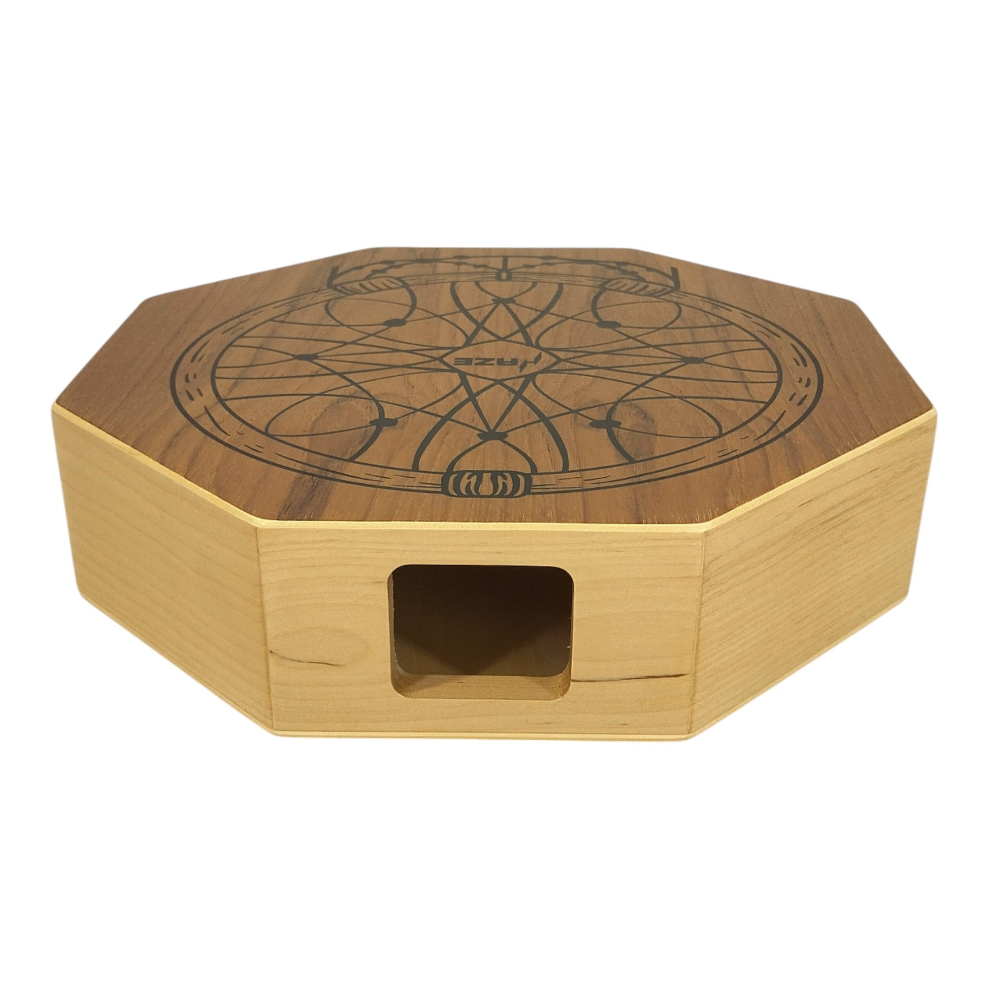 Lightweight and easy to carry, the cajon includes an adjustable black strap, letting you wear and play it comfortably anytime—perfect for travel, camping, picnics, and street performances. One side showcases a black printed dream catcher design on a natural brown stained surface with a matte finish, giving the instrument an artistic and modern look. Its flat octagonal shape not only enhances visual appeal but also ensures comfortable handling and smooth, safe play.
