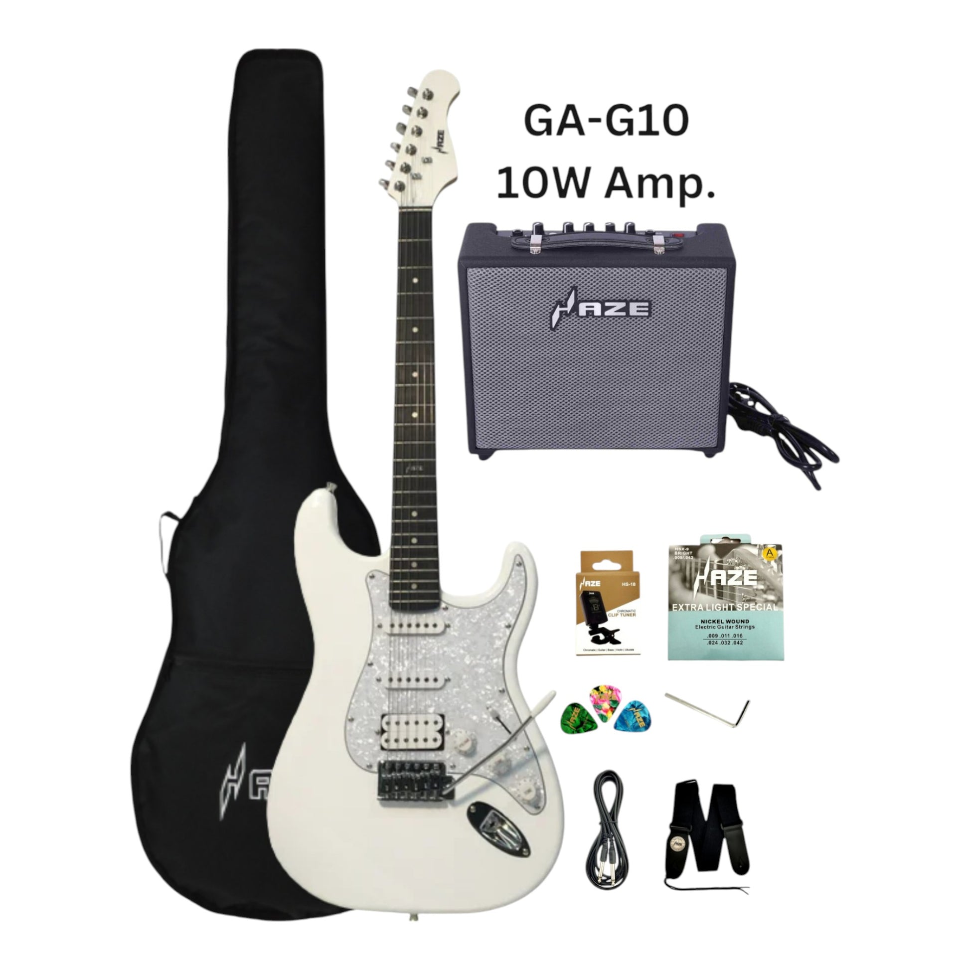Haze E211 Arctic White HST Electric Guitar with Accessories + 10W Amp. (Optional)