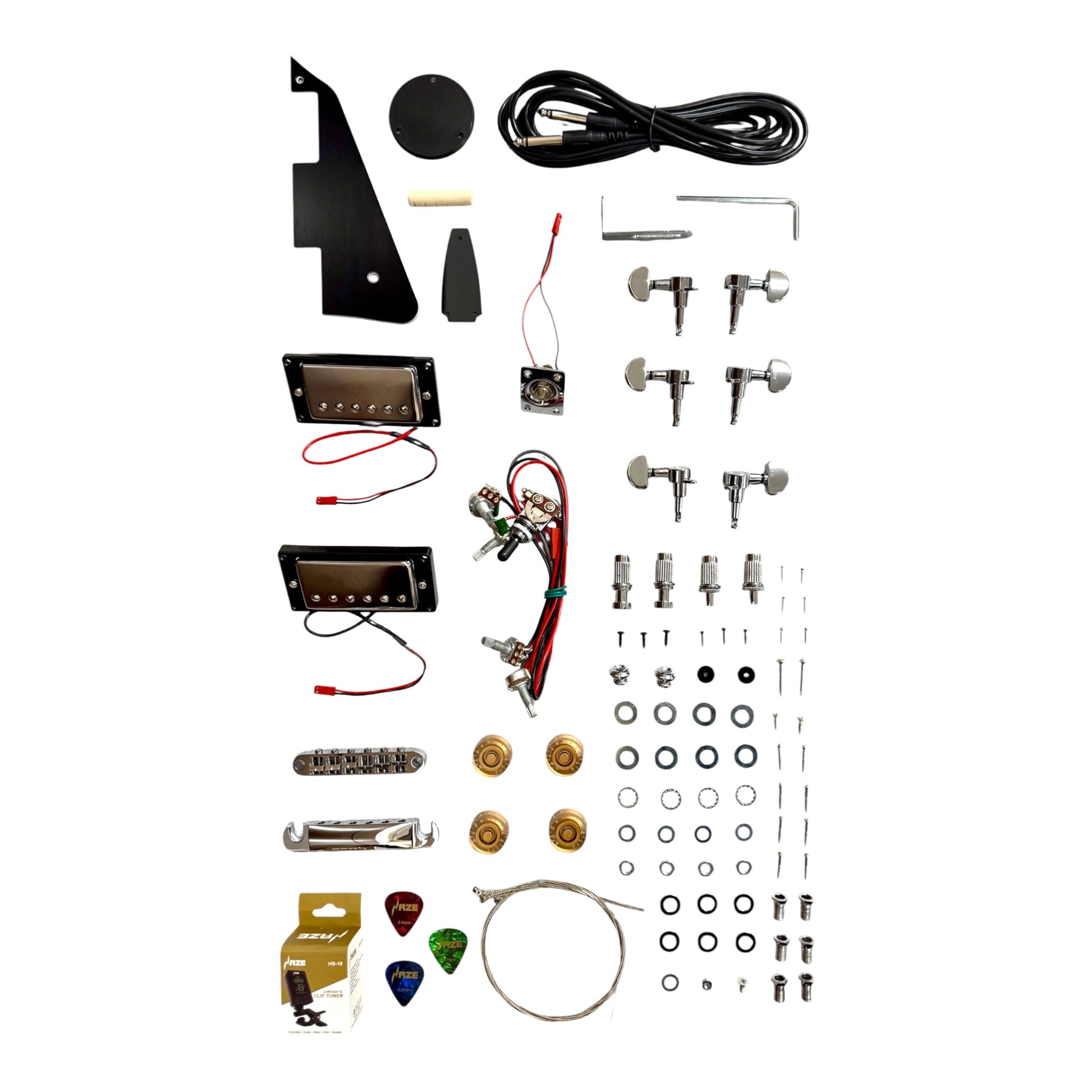 - Designed for easy assembly, the E239DIYWH comes fully pre-wired with plug-in connections—no soldering required. Dual chrome-covered ceramic humbuckers provide full-bodied lows, defined mids, and crisp highs suitable for a wide range of styles.