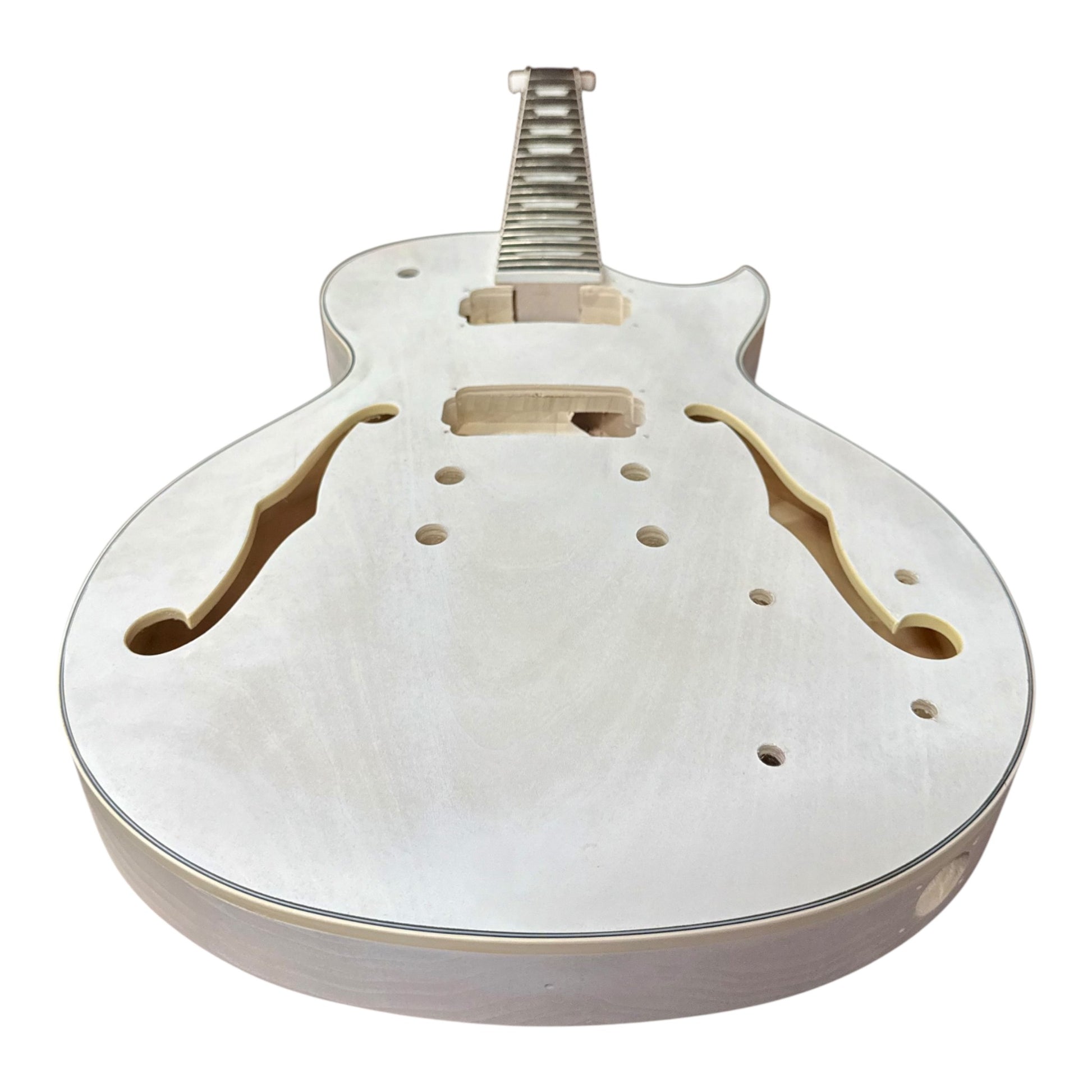 - The semi-hollow basswood construction delivers a balanced mix of warm resonance and solid-body sustain. An arched top, traditional “F” holes, and a single-cut design create a familiar classic silhouette while offering comfortable access across the fretboard. The white-primed finish provides a clean, uniform base ideal for solid colors, bursts, or detailed custom artwork.