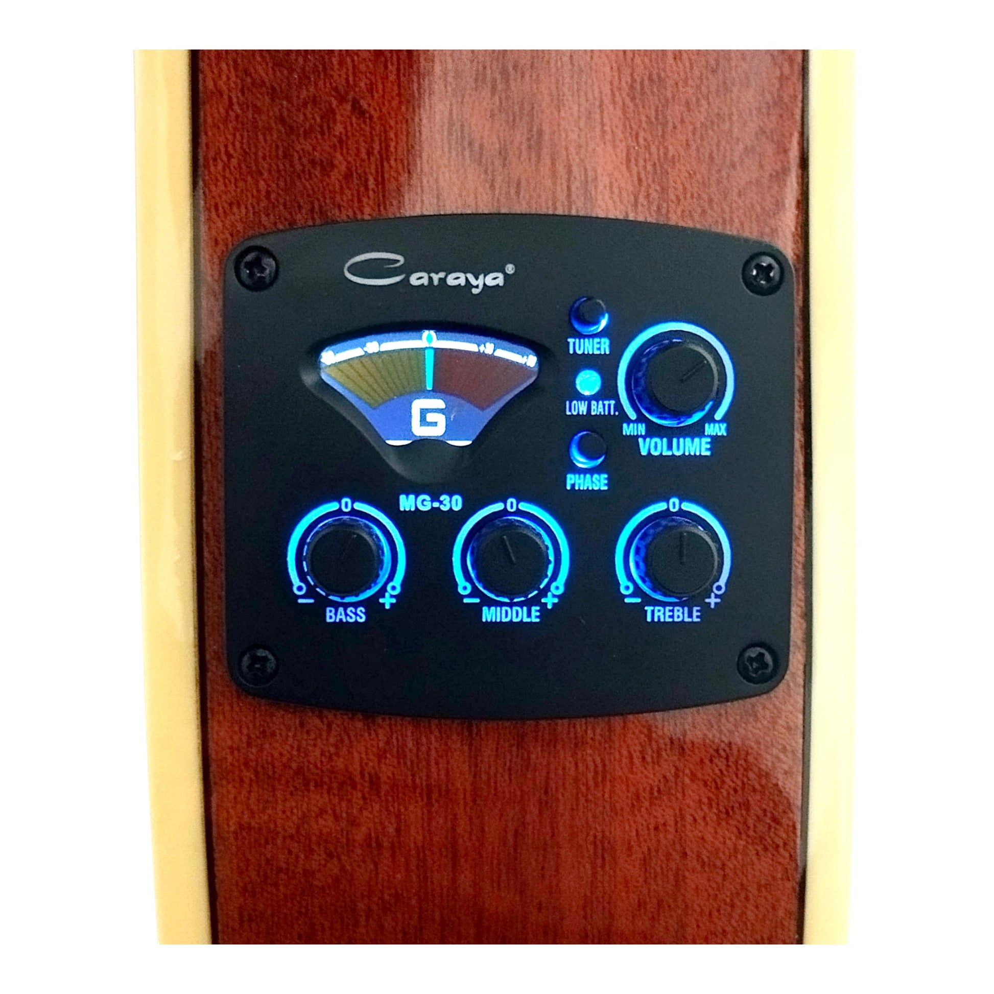 The Caraya C551BCEQ Electric-Classical Guitar has a thin-line classical cutaway body with a spruce plywood top and mahogany plywood back and sides. Chrome hardware and classical tuning machines. The narrower neck plays easily, especially for those used to steel string guitar necks. A Caraya 3-band EQ lets you amplify the sound of the nylon strings with full fidelity. A 2-way adjustable truss rod and a built-in digital tuner make this model of the classical guitar close to a perfect one.